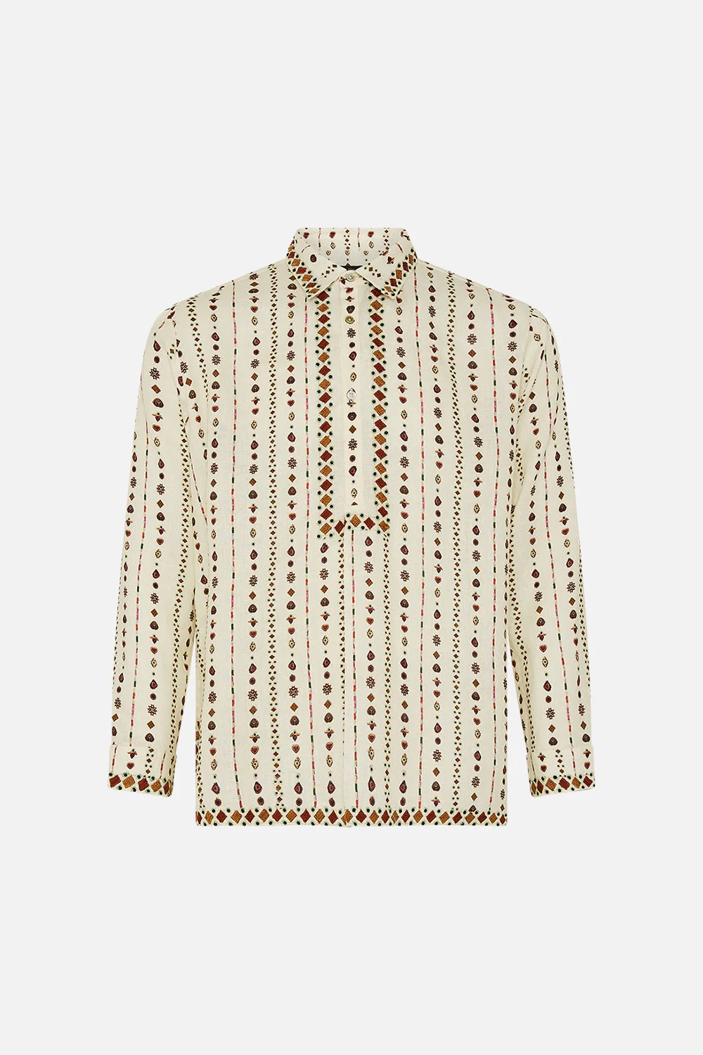 The Nomad NatureMens Half Placket Tunic Shirt pays homage to the rich and intricate textiles of the Bedouin artisans of Sinai This luxury mens tunic features a longer line relaxed silhouette that showcases a half placket pull over shape. With a bespoke print, full length sleeves and side splits this mens tunic shirt exudes statement styling. Explore more from the House Of The Sun collection.
