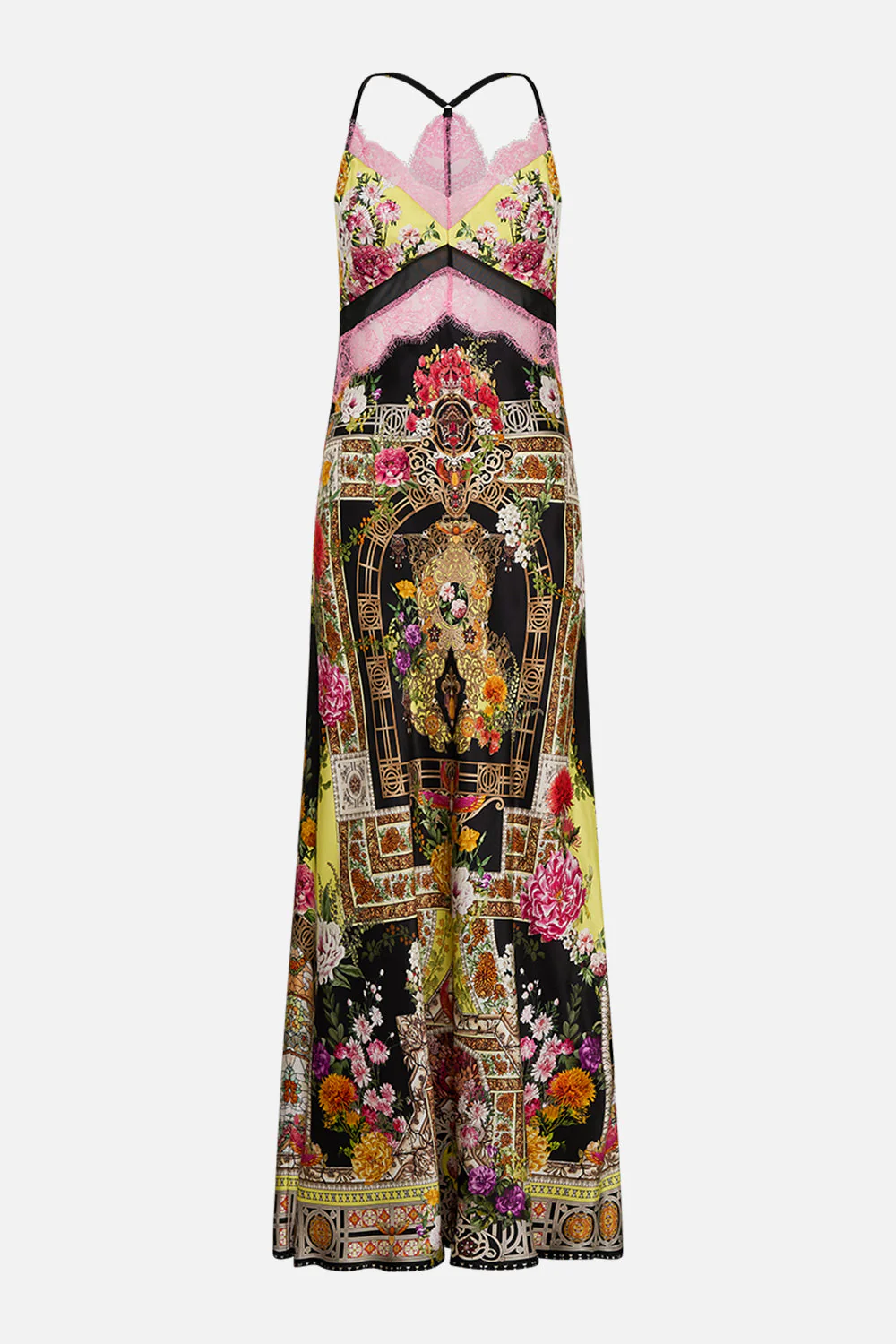Designed in Australia, The Adorned In Alexandria Lace Splice Bias Long Dress unveils an architectural haven where lush florals entwine with majestic archways beneath a tranquil sky. Lovingly handcrafted, this opulent CAMILLA creation showcases a slim silhouette that elegantly contours the body. The full-length design is enhanced with lace splicing and organza panels, while adjustable straps ensure a perfect fit. Exquisite crystal embellishments add a touch of refined luxury.