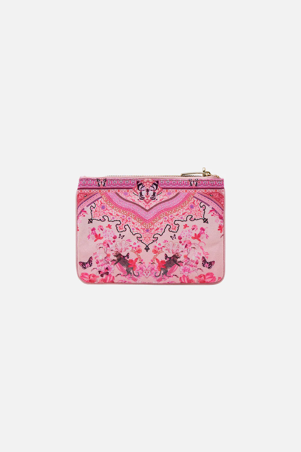 Designed in Australia, The Botanical Novella Coin And Phone Purse encapsulates a timeless elegance with butterflies delicately settled amid vivid palace florals, framed by arches and gilded borders. Lovingly handcrafted, this purse showcases a stunning bespoke print and a streamlined rectangular silhouette with contrast piped edges. It features a secure zip-top closure and is finished with a custom CAMILLA parrot clip. Inside, the compartment is designed to keep your precious treasures stored in style.