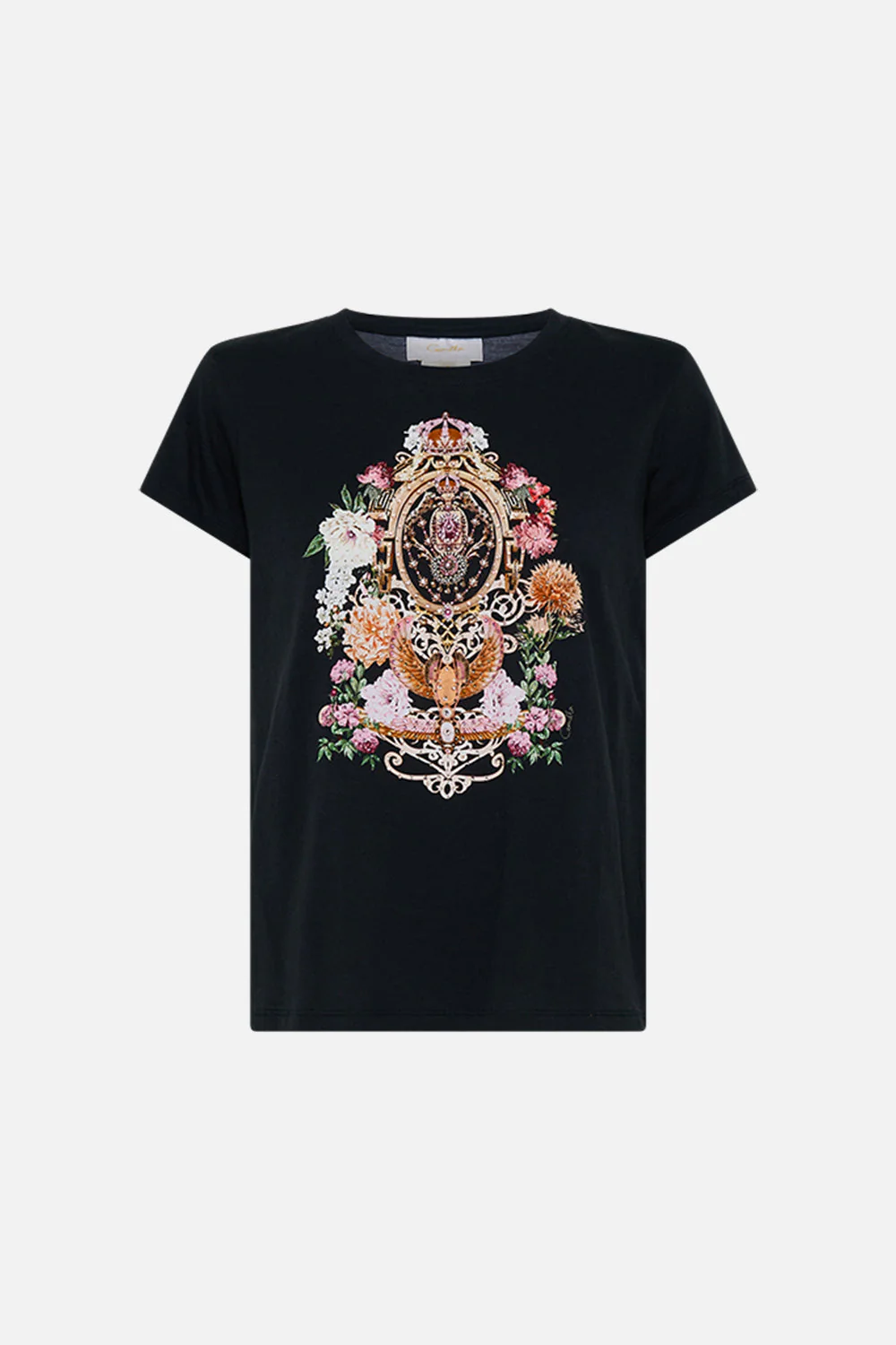 Designed in Australia, The Adorned In Alexandria Slim Fit Round Neck T-Shirt - Blk/Multi unveils an architectural haven where lush florals entwine with majestic archways beneath a tranquil sky. Lovingly handcrafted, this luxurious graphic t shirt features a slim fit throughout the body that falls to a hip length hemline. The lush short sleeves echo the slim silhouette adding a feminine element to this elevated staple piece.