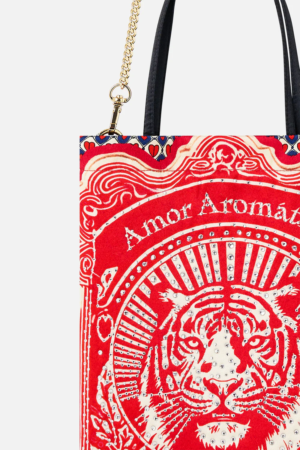 Designed in Australia, the Rinse & Roar Embellished Mini Tote prowls with daring contrasts, tigers emerge amidst red and blue strokes creating a monochromatic masterpiece of wild wonder. Lovingly handcrafted, this tote adds a touch of opulence to your everyday ensemble. Enhanced with golden hardware and embellishments which exudes a sense luxury showcasing the iconic CAMILLA decadence.