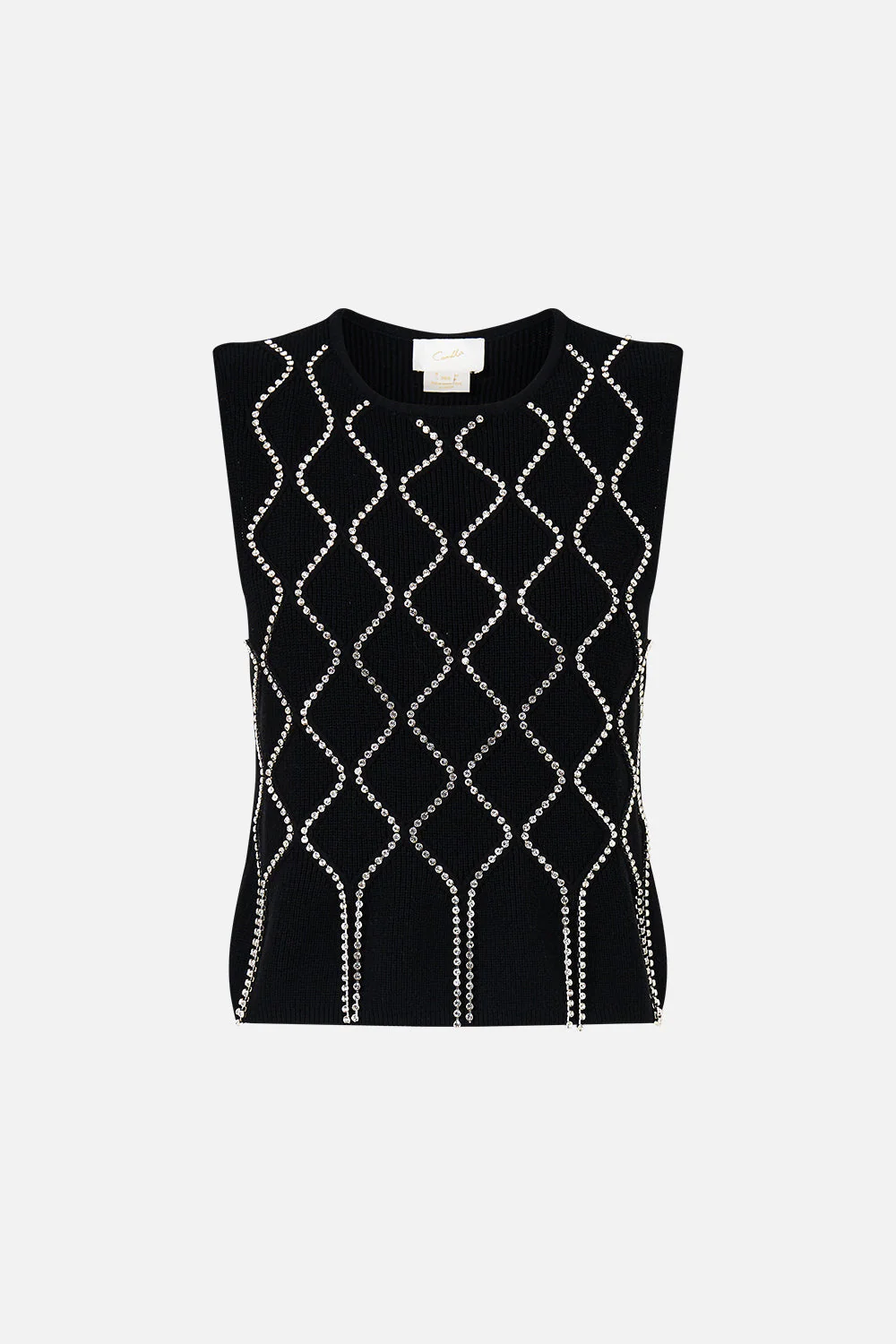 Designed in Australia, The Monarchy Mania Sleeveless Knit Tank Top Is a nostalgic ode to wanderlust, where tiles and gilded frescoes evoke the charm of vintage postcards and treasured stamps gathered on Camillaās journeys. Lovingly handcrafted, this sleeveless knit tank top features a slim fit adorned with crystal embellishments, blending simplicity with sophisticated allure.