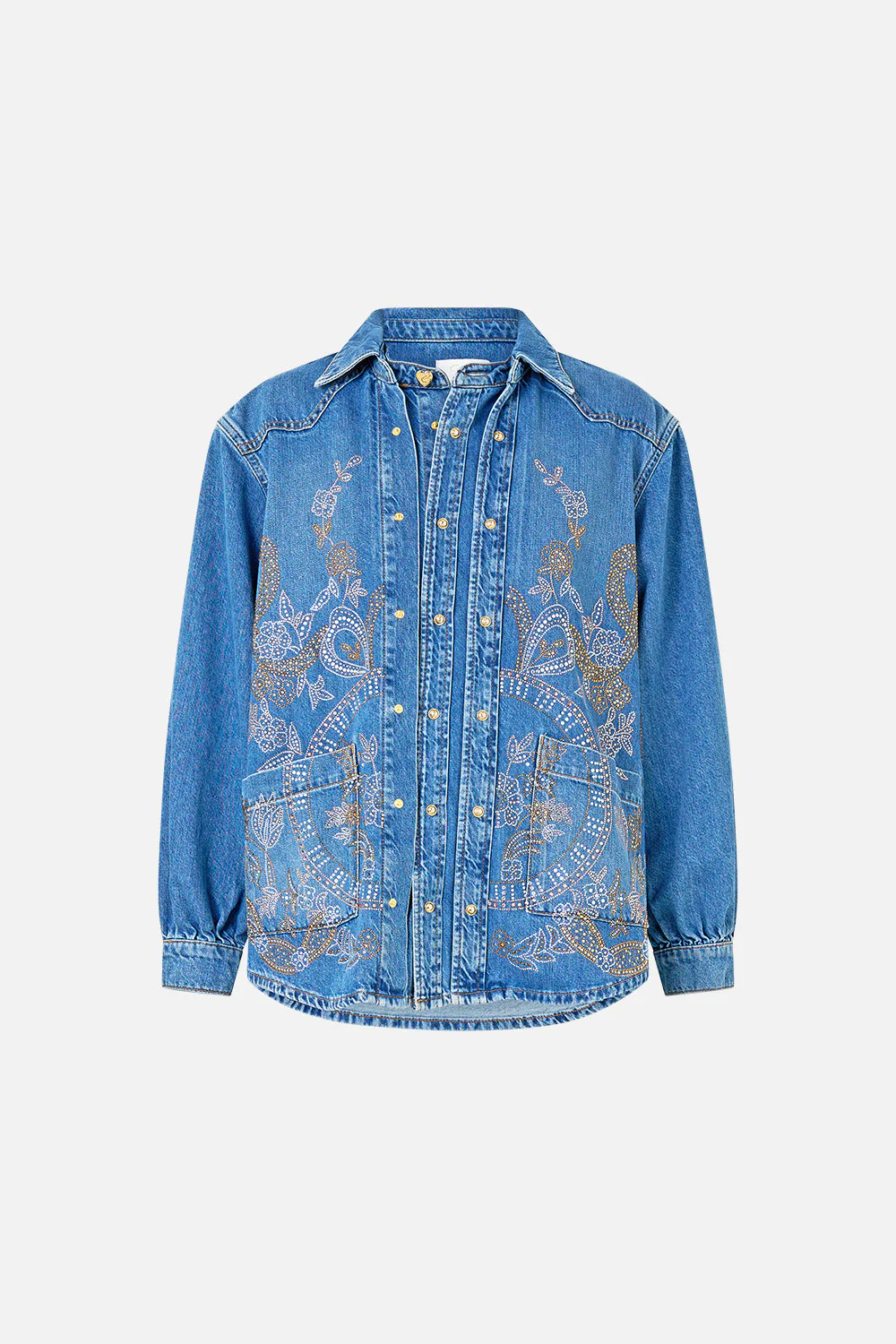 Designed in Australia, the Denim Lalita Ace Of Lace Long Line Shirt infuses decadent denim hues with intricate, artful designs, creating a striking, globally-inspired statement of modern style. Lovingly handcrafted, this mid-weight denim chambray shirt exudes effortless sophistication. With an oversized fit, snap-button front closure, and side splits, it balances comfort and style, offering a versatile addition to any wardrobe.