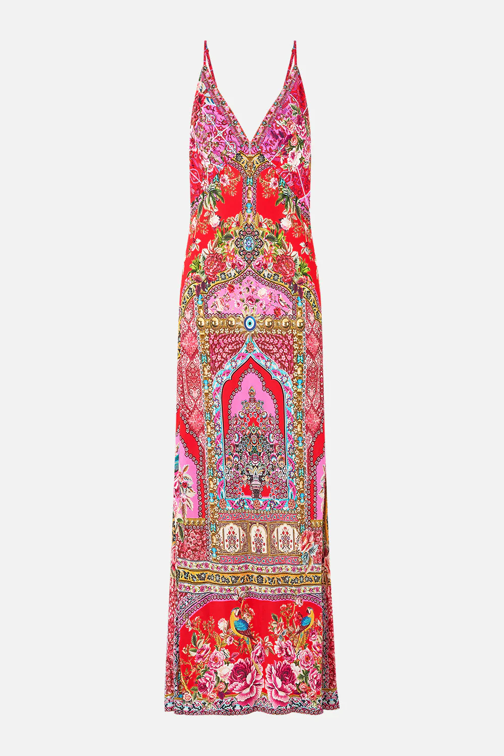 The Heirloom Empire V-Neck Full Length Bias Slip Dress is a handcrafted silk silhouette designed by our in house artisans. Reimagined in an exclusive limited edition print, our maxi slip dress is adorned with a shaped panel bustline that falls into a bias cut that skims the bodice and gently cascades into a floor length hemline. Its adjustable straps and lowered back neckline offer a sleek silhouette with effortless allure and its finished with intricately placed crystal embellishment for luminous detail.