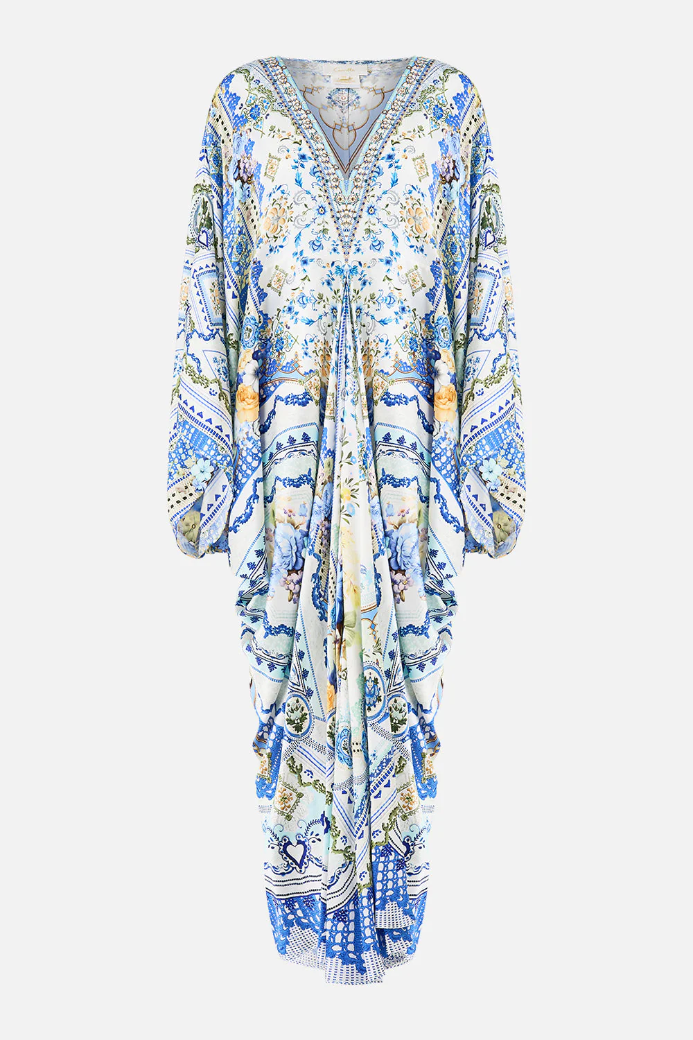 The My Homespun Heart T Shape Long Kaftan is a handcrafted silhouette designed by our in house artisans. Reimagined in an exclusive limited edition print, our signature T shaped kaftan is meticulously designed to shapeshift with a flattering v neckline adorned in crystal embellishment that floats into a relaxed maxi silhouette. Discover how to wear our kaftan in more ways than one with the CAMILLA Style Guide.