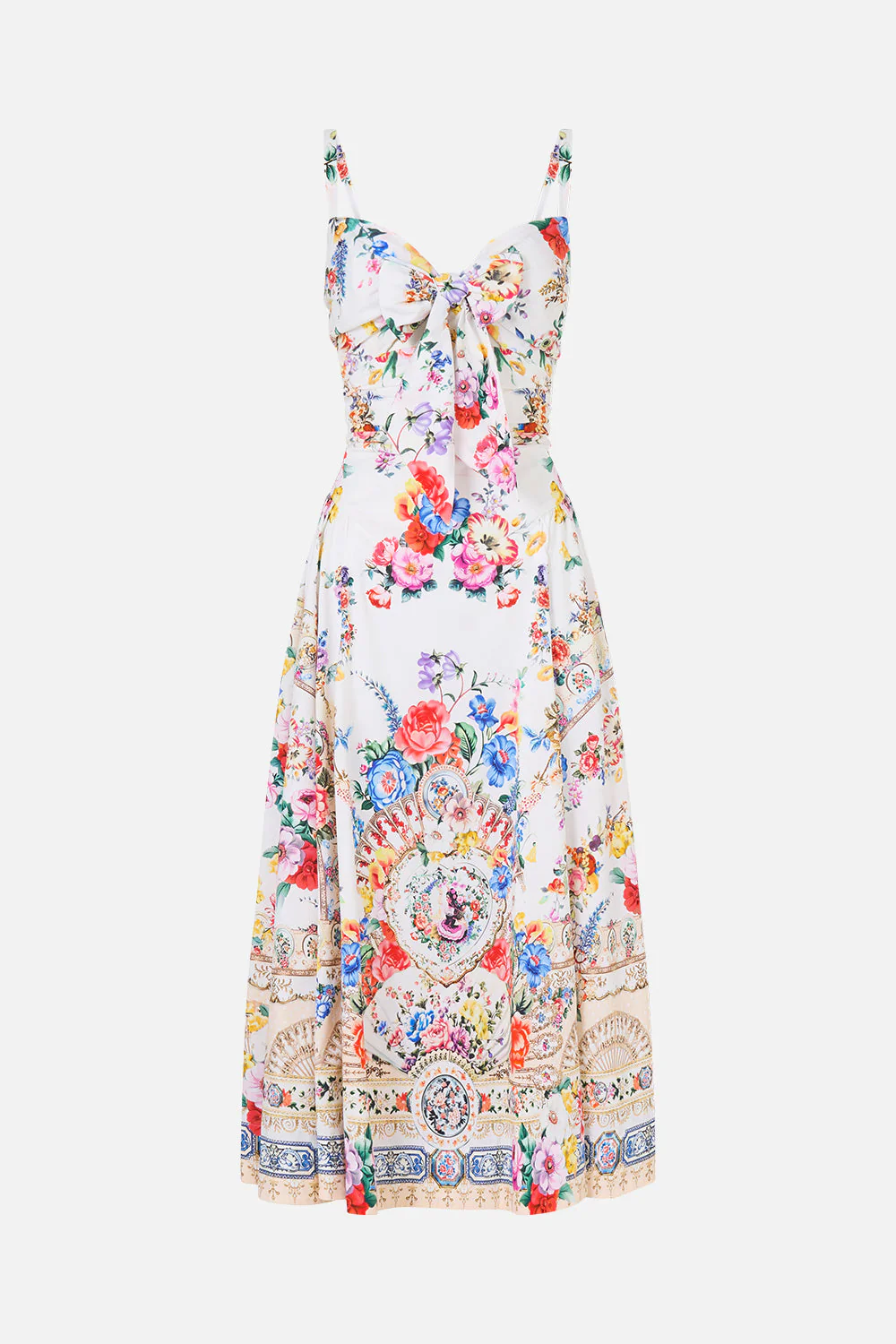 The I Left My Heart In Granada Ballerina Midi Dress is a handcrafted silhouette designed by our in-house artisans. Imagined in an exclusive limited edition print, this dress is crafted to flatter the feminine form with a ruched bodice that falls into a midi length skirt. An adjustable tie front decorates the dÈcolletage, while intricately applied crystals add luminous detail.