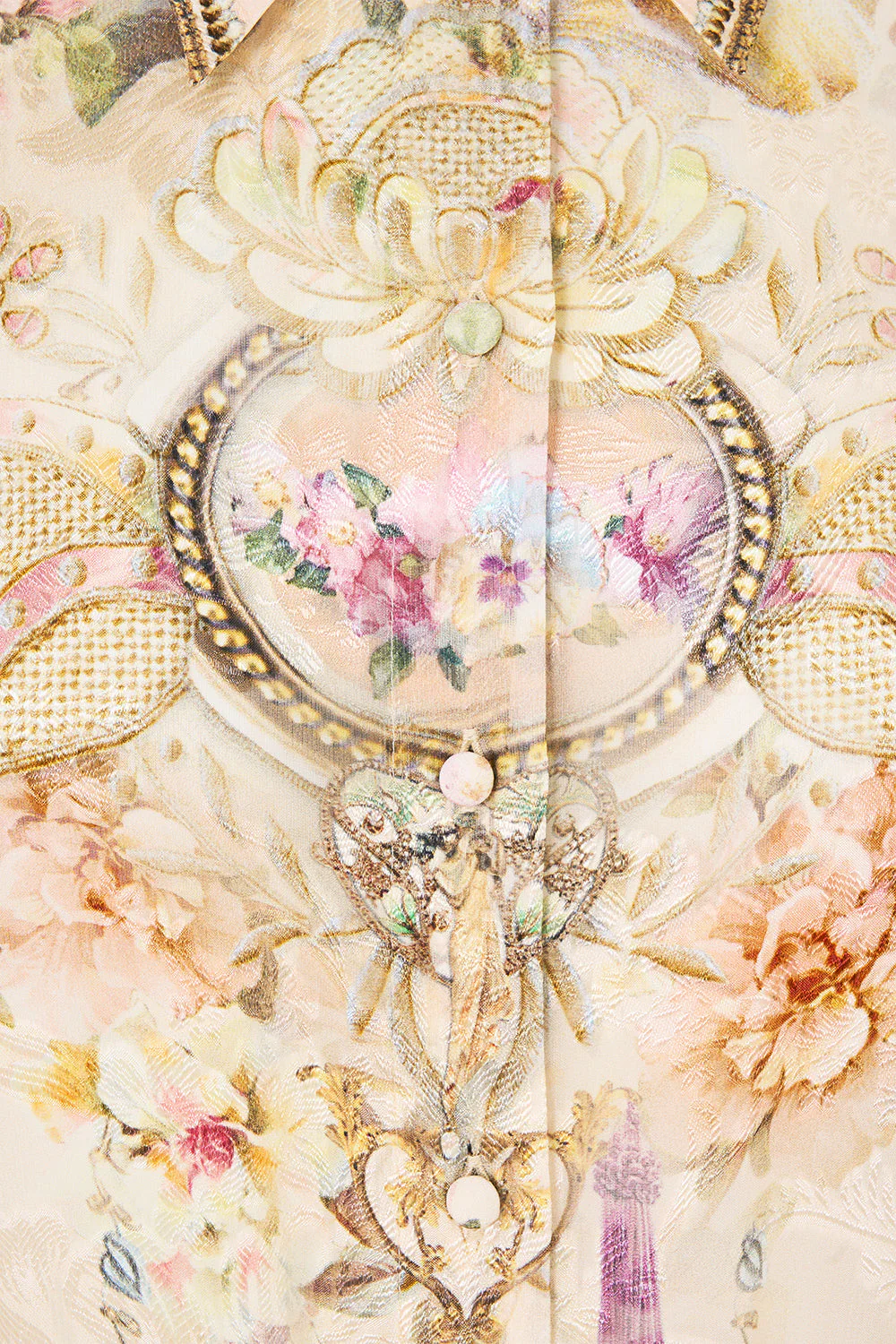 The Adorned In Aranjuez Shirt Dress With Back Button Detail is a handcrafted silhouette designed by our in-house artisans. Envisioned in an exclusive limited edition print, this luxury shirt dress is relaxed fitting and falls to a midi length hemline. It's elevated with a removable chain detail and shirt collar for versatility and finished with intricately placed crystal embellishments for luminous detail.