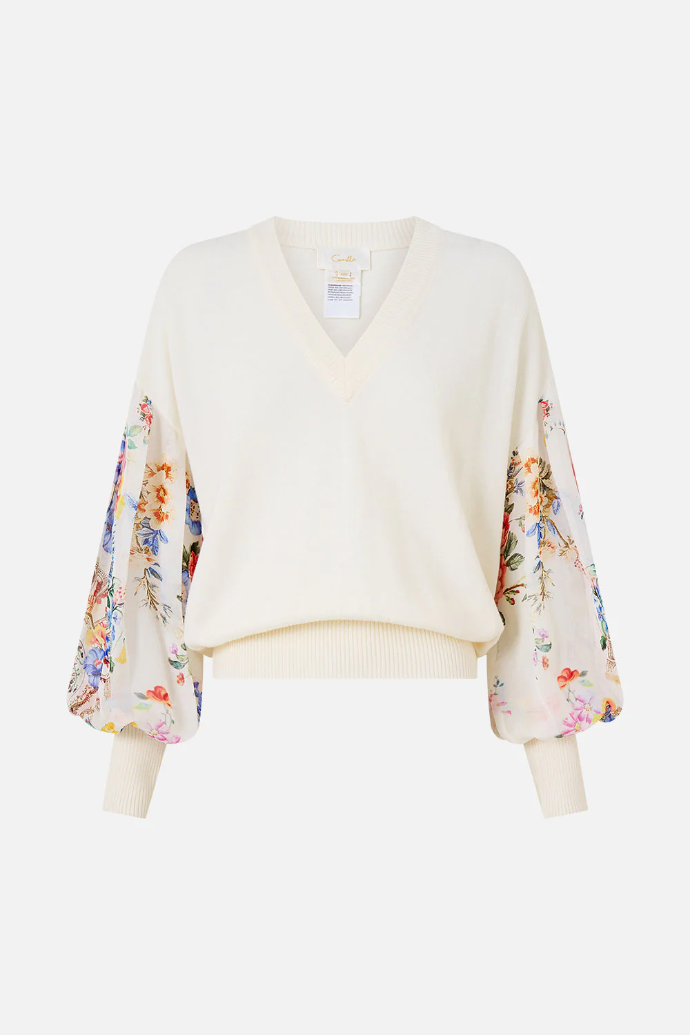The I Left My Heart In Granada V Neck Knit Jumper With Silk Sleeve is a handcrafted silhouette designed by our in-house artisans. Imagined with touches of limited edition print, our merino wool sweater drapes delicately while honouring the feminine form. Finished with silk, the arms are adorned with a romantic blouson sleeve as the waist is cinched and shaped with ribbed panelling.