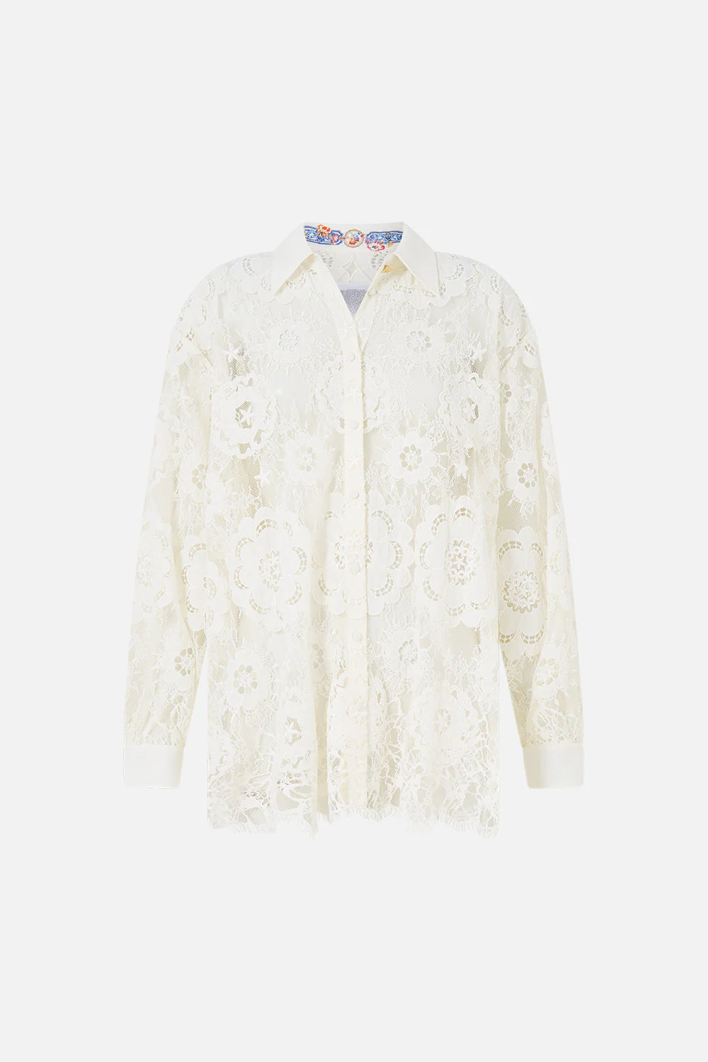 The I Left My Heart In Granada Stepped Hem Shirt is a handcrafted silhouette designed by our in-house artisans. A capsule classic, this button up shirt fuses crisp modern tailoring and dainty, romantic detailing. Thoughtfully cut into an oversized silhouette, it adorns captivating lace applique from neckline to hemline. A stepped hem and back yoke detailing complete this resort essential.